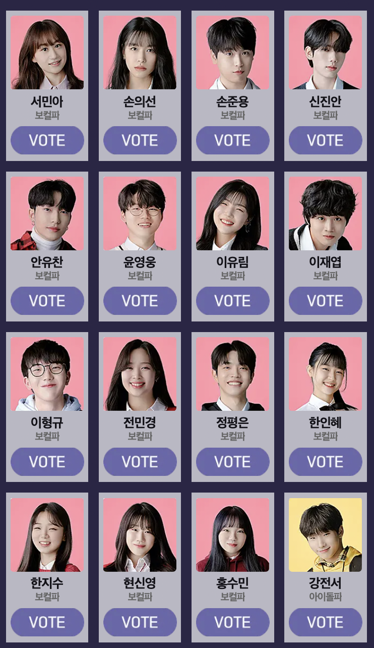 아이돌 분야에 48명, 싱어송라이터 분야에 29명, 보컬 분야에 31명이 지원해 총 108명 청춘들이 모였다. 하단에 보이는 참가자 분야와 이름을 같이 확인할 수 있으며 "VOTE"를 누르면 바로 투표를 진행할 수 있습니다.