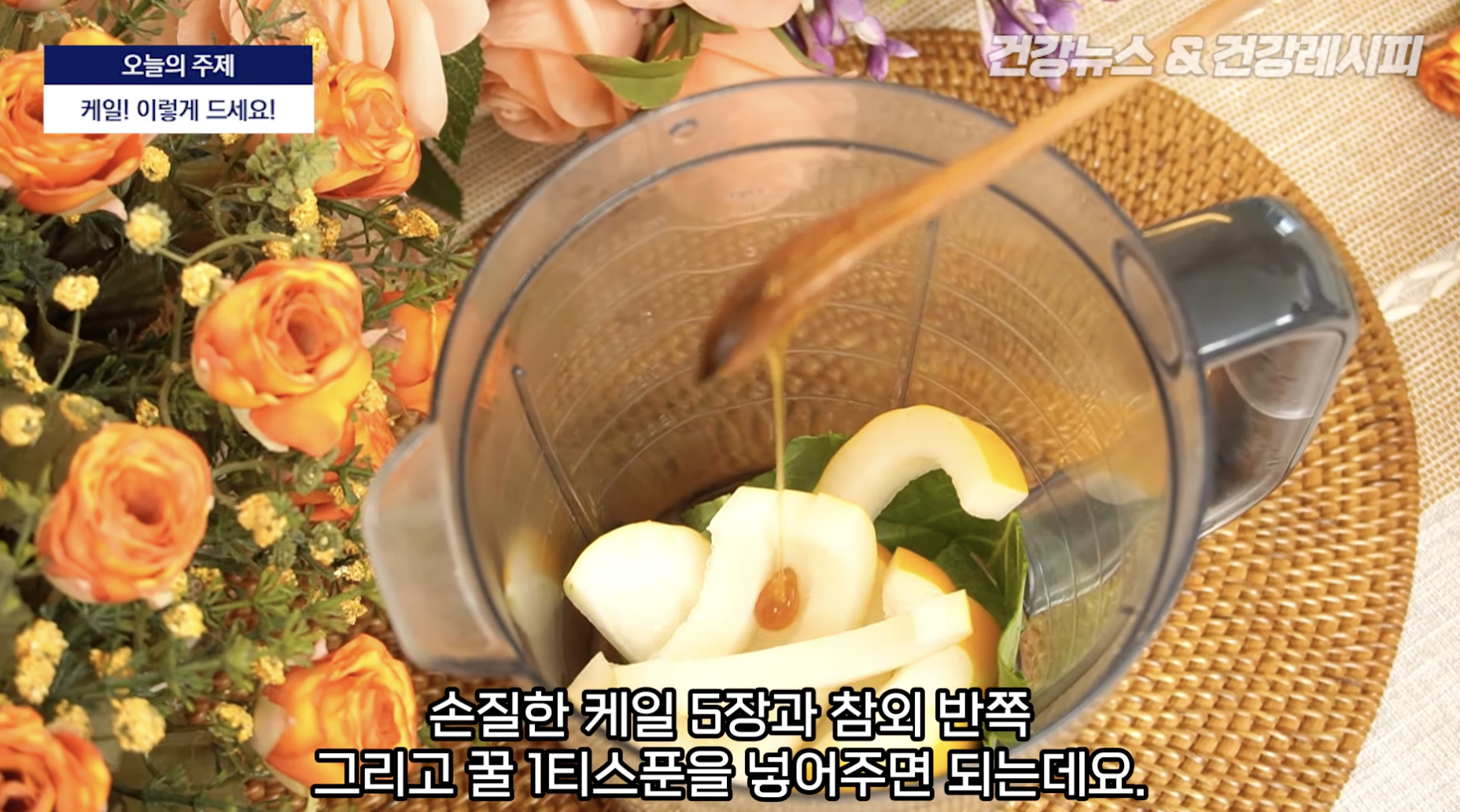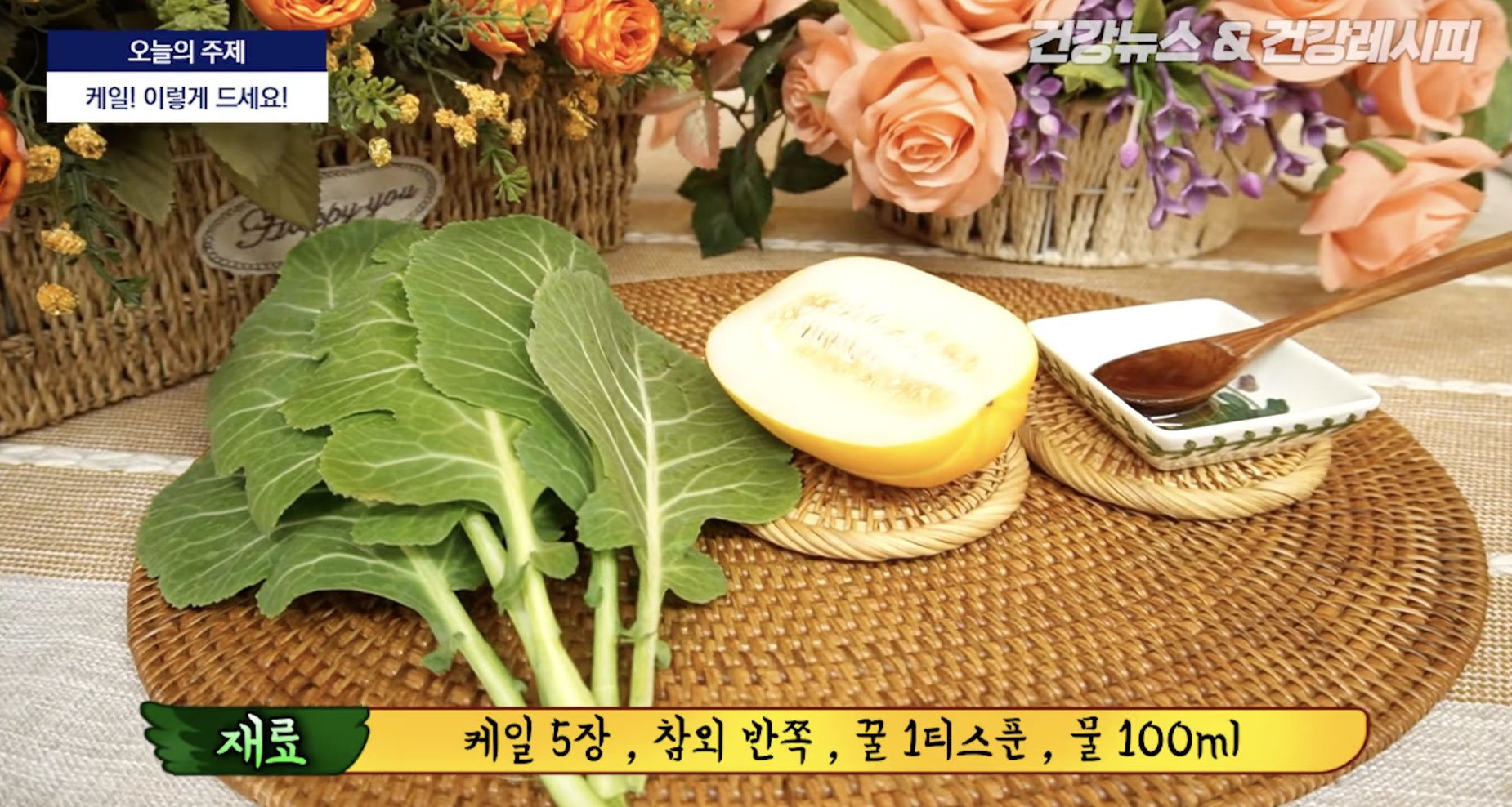 오늘 알아볼 음식은 케일 주스입니다. 케일 주스를 만들기 위해서는 케일 5장, 참외 반쪽, 꿀 1티스푼, 물 100ml 그리고 믹서기만 있으면 간편하게 먹을 수 있습니다.