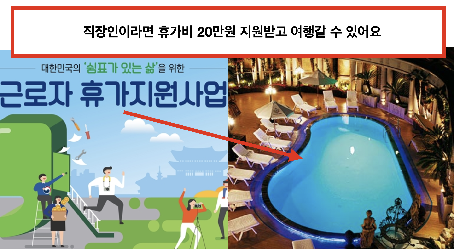 정부에서는 근로 복지를 향상시키기 위해서 근로자 휴가지원사업을 진행하고 있습니다. 대부분 모르는 지원제도이며 저 역시도 작년에 처음 알게 되었으며 본인의 지원금 20만원만 투자하면 정부와 기업에서 각 10만원 지원해주는 제도로 국내여행에 필요한 호텔, 식당, 카페 등 다양한 혜택을 실시간으로 받아볼 수 있습니다.