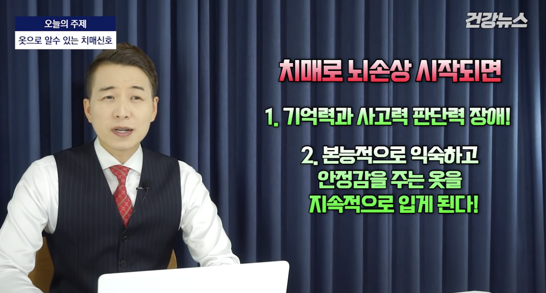 치매로 뇌 손상이 시작되면 기억력과 사고력 판단력 장애가 발생할 수 있습니다. 그러다보니 본능적으로 익숙하고 안정감을 주는 옷을 선택할 수 밖에 없습니다. 평소에 자주 똑같은 옷을 입는다면 1번쯤 의심해봐야 합니다.