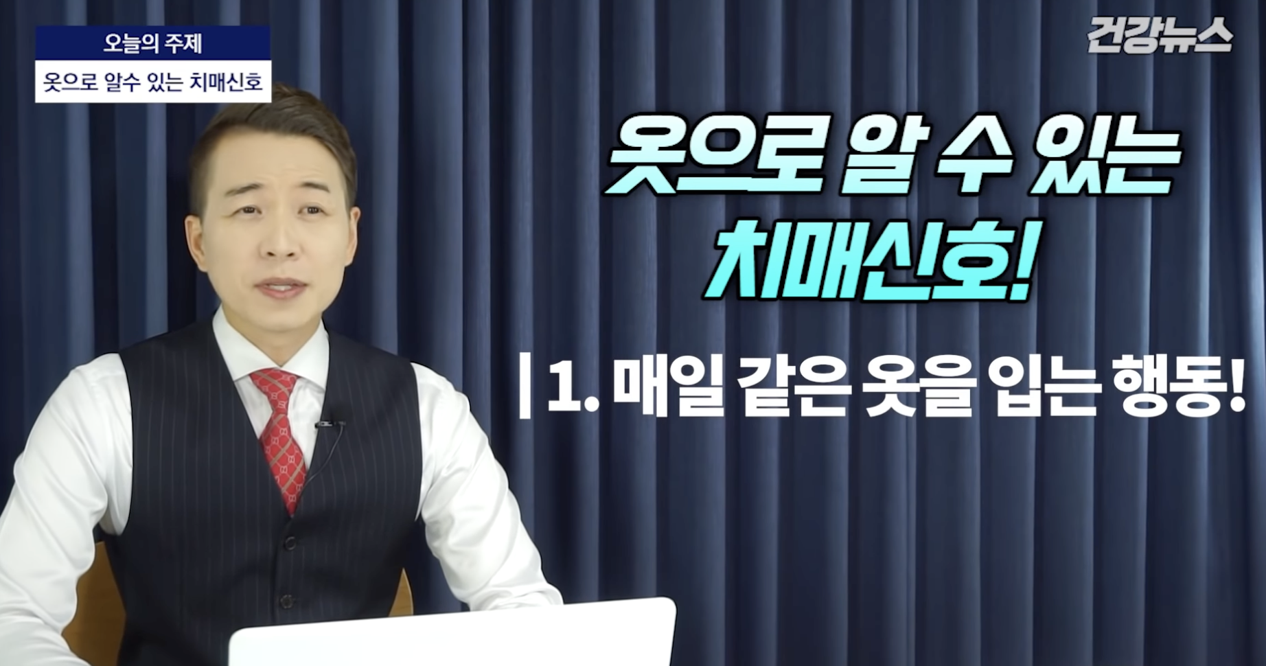 치매로 뇌 손상이 시작되면 기억력과 사고력 판단력 장애가 발생할 수 있습니다. 그러다보니 본능적으로 익숙하고 안정감을 주는 옷을 선택할 수 밖에 없습니다. 평소에 자주 똑같은 옷을 입는다면 1번쯤 의심해봐야 합니다.