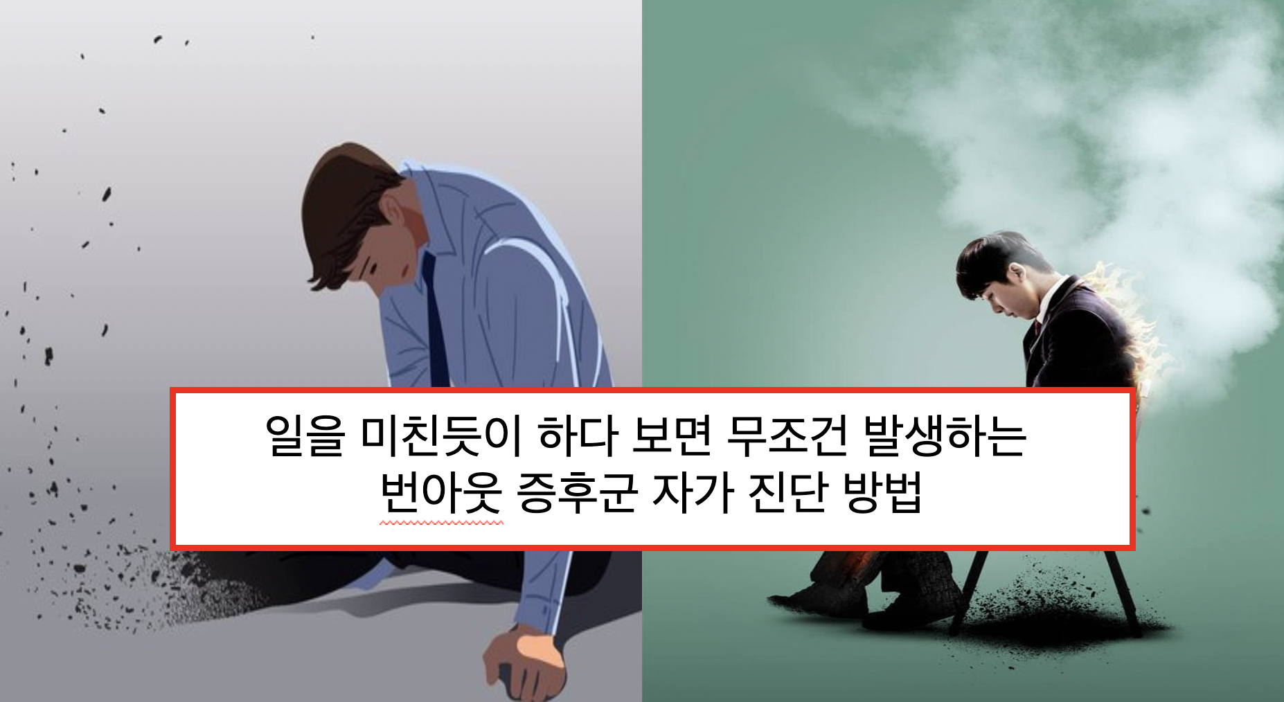 1. 맡은 일을 수행하는데 정서적으로 지쳐있다. 2. 일을 마치고 퇴근할 무렵 완전히 지쳐있다. 3. 아침에 일어나 출근할 생각을 하면 피곤을 느낀다. 4. 일하는 것에 심적 부담과 긴장을 느낀다. 5. 업무 수행에 있어 무기력하고 싫증을 느낀다. 6. 현재 업무에 대한 관심이 크게 줄었다. 7. 맡은 일을 하는데 소극적이고 냉소적이다. 8. 스트레스를 풀기 위해 폭식, 음주, 흡연 등이 찾아졌다. 9. 평소보다 짜증이 늘고 불안감이 잘 느껴진다. 10. 주어진 업무를 할 때 소극적이고 방어적으로 행동한다. *10개 항목 중 3개 이상에 해당하면 번아웃 증후군을 의심해보셔야 합니다.